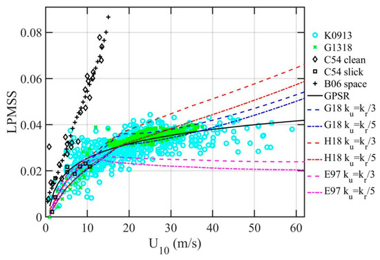 Through GPSR delay Doppler waveform analyses, there are now several sets of L band LPMSS collected in TC conditions [18,19,20,21]. These data are identified as and illustrated in Figure 5 (labeled K0913 and G1318 in the legend); the least-squares fitted curve is given by the solid black line (labeled GPSR). The data have served to address one of the most unsettled issues in the ocean surface wind wave spectrum function S(f), i.e., the spectral slope in the high frequency region [17,28]. The clarification of spectral slope is especially critical to the LPMSS determination using an ocean wave spectrum model. The refinement of the S(f) function, in turn, offers the feasibility to derive LPMSS given U10 and windsea dominant wave period Tp from operational-system measurements [29] or to create synthetic high-wind LPMSS data set with a small number of critical tropical cyclone (TC) parameters [17,27]. Also shown in Figure 6 are the LPMSS computed from the G18 () and H18 () spectrum models [17,27] with ku = kr/3 and kr/5. In addition, the results based on E97 () [30] are also displayed; the E97 is used in the CYGNSS project [31,32]. For comparison, the optical data obtained in clean and slick sea surfaces [11,12] are illustrated with black markers in the Figure. The GPSR data have expanded the wind speed coverage considerably (from 15 to 59 m/s), and they are critical for refining the ocean surface wind wave spectrum models in high wind conditions. More detail on deriving LPMSS from a wave spectrum is deferred to Section 4.1.