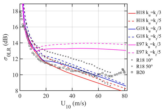 Retrieving NRCS from GPSR, or global navigation satellite system reflectometry (GNSSR) in general, remains a challenging task [22,23,24]. Here we investigate the properties of L-band NRCS through forward computation using Equation (15). The results are then compared with the most recent publications of L band NRCS results from the CYGNSS mission [23,24]. Figure 6 shows the results computed with Equation (15) and the LPMSS derived from the three spectrum models shown in Figure 5. Superimposed with the computation curves are two sets of CYGNSS data: the black crosses and pluses labeled R18 [23] are the GMF at 10° and 50°, and the black squares labeled B20 [24] are the incidence-angle-averaged result. It is clear that the CYGNSS GMF is still evolving. Interestingly, there is a good agreement between the most recent version [24] (B20: black squares) and the computed NRCS with and integrated to ku = kr/3; the model-data difference is less than about 1 dB to wind speed up to about 60 m/s. The computed NRCS with is also in good agreement with data for low to moderately high winds (U10 ≤ ~14 m/s) but fares far worse in higher winds, because E97 underestimates the LPMSS for U10 greater than about 14 m/s (Figure 5). It illustrates the importance of choosing an accurate surface wave spectrum model for ocean remote sensing analysis. More discussion on LPMSS and reflectivity |Rζη(ι)|2 is deferred to Section 4.