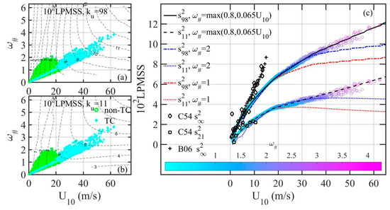 Pre-calculated H18 LPMSS contour maps for (a) ku = 98 rad/m and (b) ku = 11 rad/m. Superimposed in the Figures are the observed ω#(U10) in TC and non-TC conditions. (c) Color markers show the interpolated LPMSS for ku = 98 and 11 rad/m (upper and lower sets, respectively) using the observed ω#(U10) in TC and non-TC conditions. For comparison, illustrated with black markers are the optically sensed MSS in clean and slick waters. Also shown in the Figure are the interpolated LPMSS assuming constant ω# (1 and 2), and ω# approximated by Equation (16).