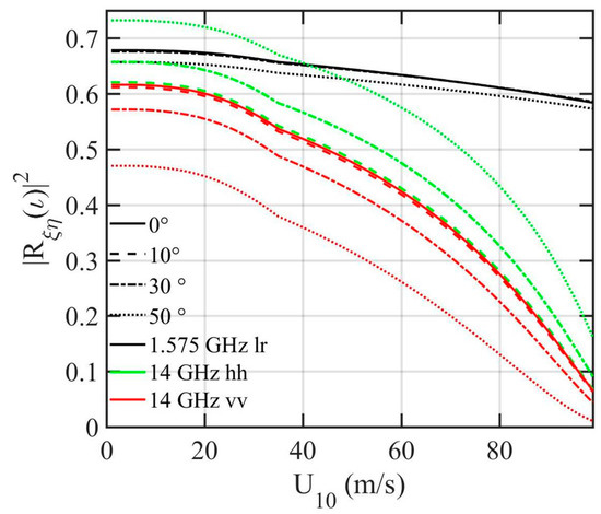 The reflectivity |Rξη(ι)|2 is a function of relative permittivity and generally treated as a constant for a given EM frequency (with the assumption of some representative sea surface temperature and sea surface salinity: 293 K and 35 psu are used throughout this paper; the relative permittivity of sea water is computed with the formula given by Klein and Swift [37]). In high winds when air is entrained by wave breaking into the water surface layer and foam covers the water surface, the modification of relative permittivity by the mixed air needs to be considered. Figure 8 shows the Fresnel reflectivity at 0°, 10°, 30°, and 50° incidence angles for Ku (14 GHz) and L (1.575 GHz) frequencies. The Ku band altimeters discussed in this paper operate with linear polarizations (h and v), so |Rhh(θ)|2 and |Rvv(θ)|2 are illustrated. The GPSR signals are right-hand-circular transmit and left-hand-circular receive, so for L band |Rlr(ι)|2 is given; its dependence on incidence angle is very weak up to about 50° incidence angle [27]. For altimeter reflection from the ocean surface, |Rξη(0)|2 is the quantity of interest (Section 3.2), and it is independent of polarization states hh, vv, and lr, but can vary considerably with wind speed as a result of air entrainment by wave breaking. The foam modification is more severe toward higher frequency as expected; this can be seen from comparing the black solid line of L band and red/green (overlapped) solid lines of Ku band. The procedure to account for the foam effect is briefly described below.