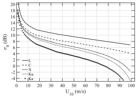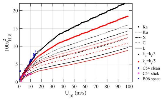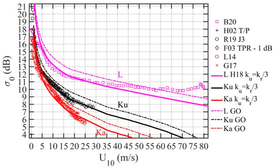 Figure 12 shows the data from all three EM frequencies together and the comparison with model computation using (14) with integrated to ku = kr/3. The number of reported data sets is considerably less in other EM frequencies. As mentioned in Section 3, there are two L band NRCS data sets reported from the CYGNSS mission [23,24]. A couple of Ka band altimeter (ALtiKa) data sets have also been reported from the SARAL mission [25,26]. For the Ka band, the model-data agreement (red markers and solid line) is close to that of the Ku band comparison (black markers and solid line). For L band, the model results with integrated to ku = kr/3 are shown (magenta marker and solid line). Less than 1 dB difference is found between model and measurements to wind speed about 60 m/s. Also shown for reference are the GO solutions Equation (9) for the three frequencies illustrated with dashed lines, which are about 1 dB too high compared to the data.