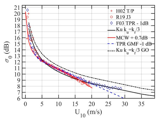 - An extensive collection of 33 years wind speed, wave height, and altimeter NRCS from 13 satellite missions ranging from Geosat to Sentinel-3A and Jason-3 [64]. The altimeter NRCS is merged with European Centre for Medium-Range Weather Forecasts (ECMWF) model wind speed in 1° × 1° grids; their Figure 3 shows an example of the Jason-3 (J3) NRCS dependence on wind speed. The maximum wind speed is about 20 m/s. These data are referred to as R19 from here on.