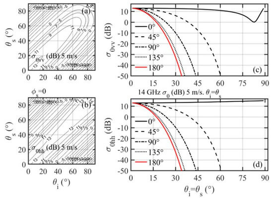 Examples of NRCS dependence on incidence and scattering angles. In-plane forward scattering (ϕs = 0°): (a) vv, (b) hh. Variation of NRCS along θi = θs for ϕs = 0°, 45°, 90°, 135°, and 180° scattering azimuth angles: (c) vv, (d) hh. The microwave frequency is 14 G Hz and wind speed is 5 m/s.