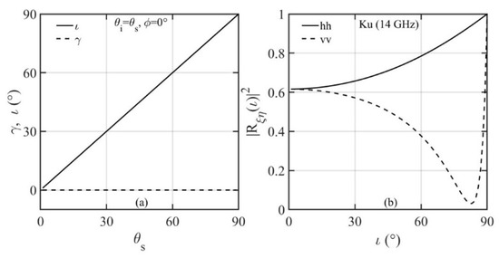 The NRCS dependence on the incidence and scattering angles hinges on ι and γ as prescribed by Equation (3) and Equation (7). Figure 13a,b show examples of in-plane (ϕs = 0°) vv and hh scattering of Ku band (EM frequency f is 14 GHz) at 5 m/s wind speed. For clarity, the contour lines are 2 dB apart for NRCS greater than 5 dB, 5 dB apart between −30 and 5 dB, and 10 dB apart for NRCS less than −30 dB. The NRCS contours are symmetric to the θi = θs line. This is a consequence of reciprocity, since we get the same set of (ι, γ) from Equation (3) and Equation (7) when θi and θs are swapped. The dropoff along the θi = θs line is relatively mild: about 2.1 dB between θi = θs = 0° and θi = θs = 60°. The NRCS dropoff with respect to Δθ = θi − θs is dependent on incidence angle. For example, with θi = 0°, the NRCS difference is about 4 dB for θs from 0° to 20°, and much steeper at large θs, about 14 dB for the same Δθ with θs from 20° to 40°. Figure 13c,d show variation of vv and hh NRCS along θi = θs for scattering azimuth angles ϕs = 0°, 45°, 90°, 135°, and 180°. Interestingly, in the in-plane condition (ϕs = 0°, solid black lines in Figure 13c,d), the SPT predicts strong NRCS even at low grazing angles. For this configuration (θi = θs, ϕs = 0°), γ = 0°, ι = θi = θs (Figure 14a), the in-plane specular forward scattering is just like altimeter that reflects from flat facets (γ = 0°), except that now the effective incidence angle is ι = θi = θs, and the NRCS is . For the same ocean surface roughness, it varies only with the surface reflectivity (Figure 14b). Bistatic radars have been used in establishing forward-scatter fences for air and sea craft detection based on the strong forward scattering principle [65,66,67,68,69]. In the out-of-plane conditions (ϕs ≠ 0°), the dropoff toward grazing is rather rapid at large θi = θs. More discussion on the dependence on scattering azimuth angle is given later.