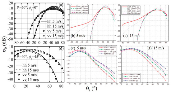 Figure 15d shows the out-of-plane NRCS dependence on θs for θi = 40° and ϕs = 45°. The high wind NRCS is larger than that of the low wind because of the broader beamwidth of scattering from the rougher surface. The SSA and TSM solutions for the conditions given in Figure 15d are given in Figure 6a and Figure 7a of A06, which are reproduced as Figure 15e,f, respectively, for 5 and 15 m/s. The agreement between SPT and TSM or SSA is fair. The difference between SPT and TSM or SSA is comparable to the difference between TSM and SSA. All three produce similar results near the specular angle.