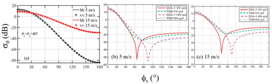 (a) Examples of NRCS dependence on ϕs, f = 14 GHz, θi = θs = 40°, U10 = 5 and 15 m/s; (b) and (c) are the SSA and TSM solutions reproduced from Figure 8 of A06 for U10 = 5 and 15 m/s, respectively.