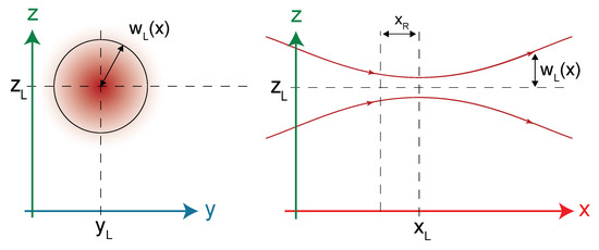 where is a normalized Gaussian profile and is the laser radius which depends on the Rayleigh length , with the laser emission wavelength.