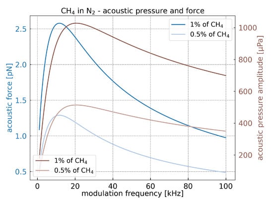 Due to the thermal relaxation time, the modulation frequency strongly affects the heat production rate (Equation (2)) and subsequently the acoustic force. Indeed, to allow the molecules to thermalize efficiently, the laser modulation needs to be lower than the molecules relaxation time.