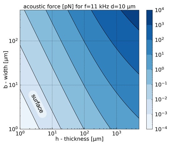 Acoustic force for of in as a function of width b and thickness h of the cantilever. For different thickness, the length is adjusted to maintain constant frequency: 11 kHz. This frequency was chosen to maximize acoustic force. The area with the weakest acoustic force corresponds to cantilevers with the smallest surface.