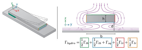 where , , , are the density of the beam, the density of the fluid, and the real and imaginary parts of the hydrodynamic function, respectively. The total hydrodynamic function originates from the linearized Navier–Stokes equation. Thus, it can be represented as a linear combination of hydrodynamic functions originating from each sidewall of the beam cross-section [33]. Pictorially, it is presented in Figure 5, while mathematically it is expressed as: