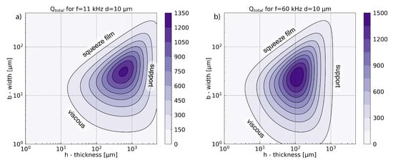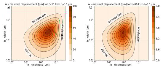 where is a fluid density, the acoustic wave number and is the speed of sound. Numerical calculations using Equation (11) show that the losses due to acoustic radiation become important when the cantilever length is comparable to the acoustic wavelength . It is less significant at low frequencies. Moreover, acoustic losses increase quickly as the width increases and the thickness decreases (for constant-frequency regime). For instance, for m and m .