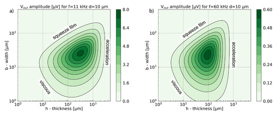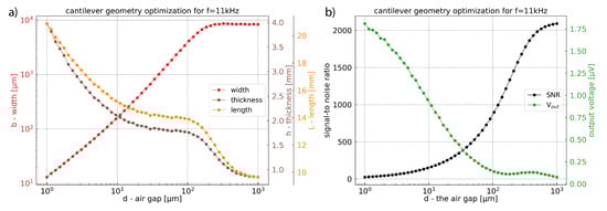 This section focuses on the effect of the distance between electrodes d (Figure 1) on the general sensor performance for a constant resonance frequency of 11 kHz. The analytic solutions previously presented (Equation (27)) were implemented in a Python programming environment to estimate an optimal value of signal-to-noise ratio for each value of the gap d. Subsequently, for each optimal SNR value, we get the geometrical parameters of the cantilever (width, length, thickness, Figure 11a) and their corresponding output voltages (Figure 11b).