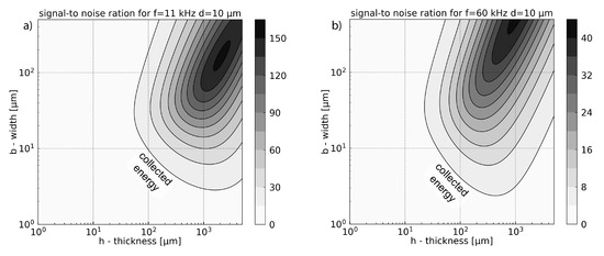The second significant parameter in Equation (27) is the pulsation . Unlike the previous result, reduces the difference between low and high frequencies. This is due to the fact that SNR is inversely proportional to the square root of frequency , while the amplitude of displacement is inversely proportional to the frequency square power . For instance, the ratio between maximal value of SNR at 11 kHz and 60 kHz is around 22 times lower than the ratio of displacement. This indicates that for SNR the frequency term is less significant than in terms of displacement (voltage output).