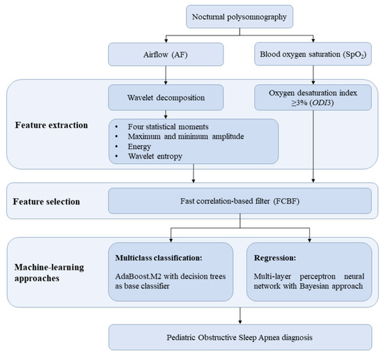 Figure 1 shows the scheme of the stages followed in this study: (i) feature extraction to characterize AF by means of WT, as well as to compute ODI3, (ii) feature selection using the fast correlation-based filter (FCBF) to obtain an optimal feature subset, and (iii) application of machine-learning approaches to carry out multiclass classification and regression. The multiclass classification was performed to determine the OSA severity degree through AdaBoost.M2 with decision trees as base classifier. Regarding to the regression process, it was carried out to estimate the AHI of each child by means of multi-layer perceptron neural network with a Bayesian approach (BY-MLP). In this sense, recent studies have shown the usefulness of these selection and machine-learning methods in the context of pediatric OSA diagnosis [12,17].