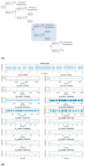 Hence, as shown in Figure 2a, DWT can be implemented as a cascade of recursive filters, each of them followed by a subsampling process by 2 (dyadic sampling) to reduce the sampling frequency and increase the spectral resolution [24,29,32]. Thereby, the low frequency band can be split again, thus generating new levels of decomposition. At each decomposition level j, after the corresponding filter and subsampling, the approximation Aj (low frequency) and the detail Dj (high frequency) signals are obtained [24,25,29]: