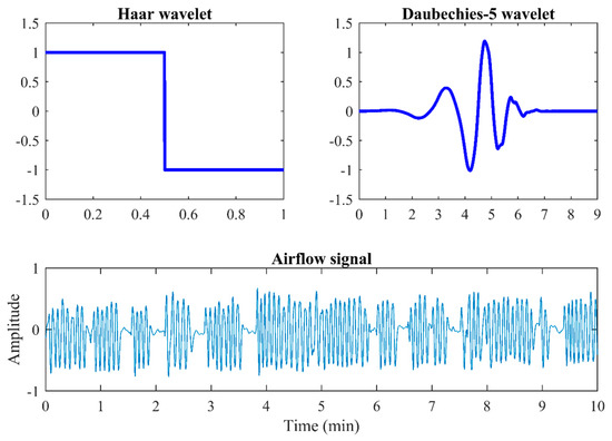 In our work, Haar and Daubechies-5 wavelets have been evaluated due to their previous suitability to the AF signal [33,34]. Figure 3 shows the mother wavelets Haar and Daubechies-5, as well as a 10-min segment of AF signal. Haar is the simpler orthonormal wavelet, which does not cause edge effect due to it uses a single vanishing moment and a support width = 1 (Figure 3) [35,36]. It would avoid ignoring the relevant information contained in these regions. Moreover, the stepped shape of the Haar wavelet would allow to detect abrupt reductions of AF caused by apneic events. Regarding Daubechies-5, it uses 5 vanishing moments and a support width = 9 (Figure 3). When increasing the vanishing moment and the support width, the time-frequency localization improves [37,38], but the edge effect also increases [36]. Hence, the Daubechies-5 wavelet would provide a better localization while causing less edge effect than other higher order variants, such as Daubechies-10 or Daubechies-20 [36]. In addition, its shape resembles an AF signal, which would allow a better setting.