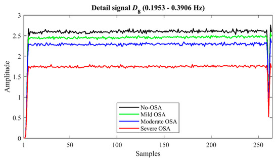 Due to the amplitude reductions of the AF signal produced by apneic events [15], as well as the ability of the DWT to assign low coefficients to the flatter signal parts and high coefficients to the steeper [42], it is expected to find higher coefficients in the signal D8 of the subjects without OSA. Consequently, and according to previous spectral analyses of AF [16,43], higher values of M1D8, M2D8, MaxD8, and MinD8, as well as lower values of M3D8 and M4D8, are expected in these subjects. In addition, it is also expected that there will be greater activity in the normal breathing band in the absence of apneas and hypopneas, i.e., that subjects without OSA have a higher ED8. Regarding WE, it has been observed that apneic events introduce changes in time and frequency domains of AF signal of children [11,12,16]. Thus, AF signals are expected to be more irregular (higher values of WE) as OSA severity increases. Thereby, since DWT allows to obtain higher frequency resolution at low frequencies, it is expected to provide a more detailed analysis than classical spectral analysis.