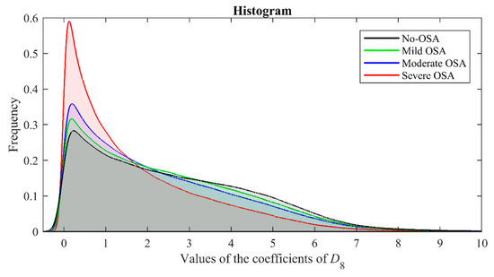 Figure 4 displays the averaged detail signal D8 for each severity group in the training dataset. In this figure, higher amplitude values of D8 can be observed in subjects without OSA. In addition, the frequency distribution of the values of the D8 coefficients as OSA severity increases can be visualized in Figure 5. According to this figure, coefficients close to 0 are more frequent in children with OSA, increasing the asymmetry and the sharpness of the peak of the distribution as the AHI increases.