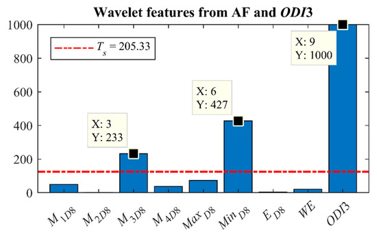 We carried out 2 selection trials, one only with wavelet features from AF and another that also included the ODI3. FCBF was applied to 1000 bootstrap replicates obtained from the training group. In the trial with wavelet features from AF, only M3D8 was selected more than Ts times (Ts = 125.25). As can be seen in Figure 6, M3D8, MinD8, and ODI3 exceeded this threshold (Ts = 205.33) when ODI3 was included in the selection process.