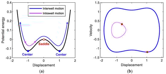 (a) Double-well potential energy function of the electromagnetic bi-stable energy harvester. The open and solid circles indicate the saddle and center points, respectively. (b) Phase plane representation of the intrawell and interwell oscillations (of period ), which are denoted by thick (blue) and thin (magenta) lines, respectively, obtained when A = 0.02 and ω = 0.82. In (b), the red points indicate the stroboscopic projections of the oscillations, which are synchronized with the period T of the base excitation.