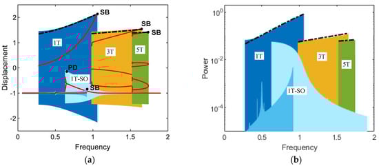 Frequency responses for (a) displacement and (b) output power of the electromagnetic bi-stable energy harvester obtained when A = 0.02: (1T) primary harmonic period-T interwell motion, (1T-SO) period-T intrawell motion, (3T) subharmonic period-3T interwell motion, and (5T) period-5T interwell motion. The saddle-node bifurcations and period-doubling bifurcation are designated by points SB and PD, respectively. In (a), the red dots indicate the stroboscopic projections of the oscillations, which are synchronized with the period T of the base excitation. The dashed-dotted lines are the harmonic balance solutions for the primary harmonic and subharmonic interwell motions, which will be discussed in Section 4.