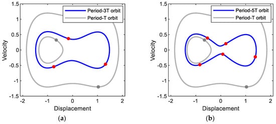Phase plane representations of (a) period-3T and (b) period-5T motions obtained with the base acceleration of A = 0.02 and forcing frequencies of (a) ω = 1.37 and (b) ω = 1.65, respectively. The period-T interwell and intrawell motions of Figure 2b are also presented for comparison purpose. The solid circle dots indicate the stroboscopic projections of the oscillations, which are synchronized with the period T of the base excitation.