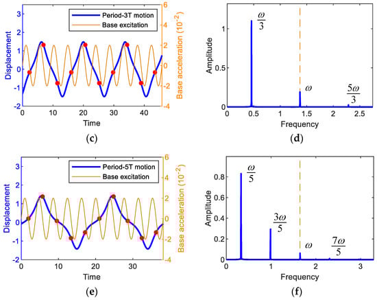 (first column) Time responses and (second column) the associated amplitude spectra, obtained by the fast Fourier transform. In (a,b) the period-1T motion when A = 0.02 and ω = 0.82, in (c,d) the period-3T motion when A = 0.02 and ω = 1.37, and in (e,f) the period-5T motion when A = 0.02 and ω = 1.65. The base excitation used for this simulation is also presented for comparison. In (a,c,e), the red dots indicate the stroboscopic projections of the oscillations, which are synchronized with the period T of the base excitation.