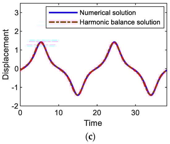 Substituting Equations (6a)–(6c) into Equations (3a) and (3b), followed by equating the coefficients of like harmonic components, leads to a system of non-linear algebraic equations for unknown variables , , , and , which are numerically solved by the Newton–Raphson method. As shown in Figure 3, the harmonic balance solutions (dashed-dotted lines) for primary harmonic and subharmonic interwell motions are well matched with the numerical solutions. Additionally, time-domain comparisons are made in Figure 6, where numerical and analytical results are also in a good agreement with each other.