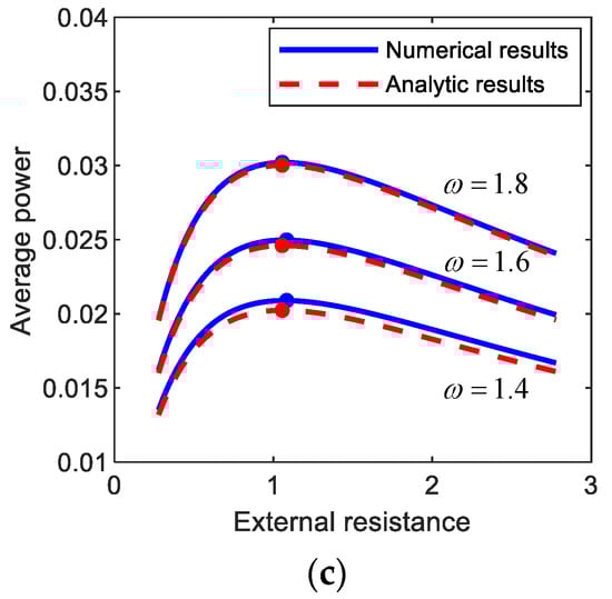 Figure 7 shows the average output powers, harvested from (a) period-1T, (b) period-3T, and (c) period-5T motions, with respect to the external load resistance. The numerical and semi-analytical results are compared to each other in Figure 7. As shown in this figure, the analytic and numerical results for the average output powers are well matched with each other. Furthermore, the optimal values of the external load resistance were evaluated, and it was observed that the analytic results are in an excellent agreement with numerical results with a maximum relative error of less than (a) 0.3%, (b) 2.0%, and (c) 1.5%. This observation supports the validity of the semi-analytic approach to optimize the external load resistance implemented in this study.
