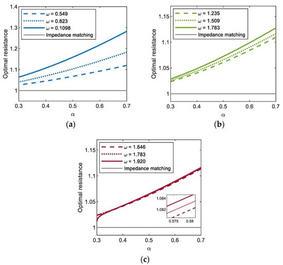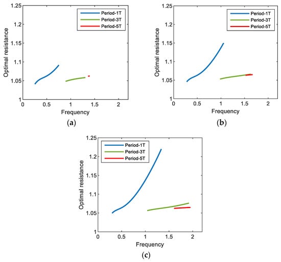 Figure 8 shows the optimal values of the external load resistance for (a) period-1T, (b) period-3T, and (c) period-5T motions of the electromagnetic energy harvester, obtained by using the semi-analytic method, with respect to the resonant inductive reactance. In this figure, the results clearly indicate that the optimal load resistance of the electromagnetic energy harvester can be significantly affected by the resonant inductive reactance and excitation frequency. For all the period-1T, 3T, and 5T motions, the optimal load resistance increases as the dimensionless resonant inductive reactance increases––in other words, as the inductance () of the solenoid coil becomes relatively larger––and accordingly, it deviates from the optimal value (i.e., 1) estimated by the resistance-matching technique, in which the inductance of the coil is assumed to be zero. Such a deviation tends to be larger when the frequency () of the base excitation is higher, which is more remarkable for the interwell motion of the shorter oscillation period (in the order of periods (a) 1T, (b) 3T, and (c) 5T in Figure 8) or higher oscillation frequency (in the order of (a) , (b) , and (c) ). From these observations, it is deduced that the optimal load resistance depends on the inductive reactance of the coil, which is defined by , in addition to the internal resistance () of the coil.