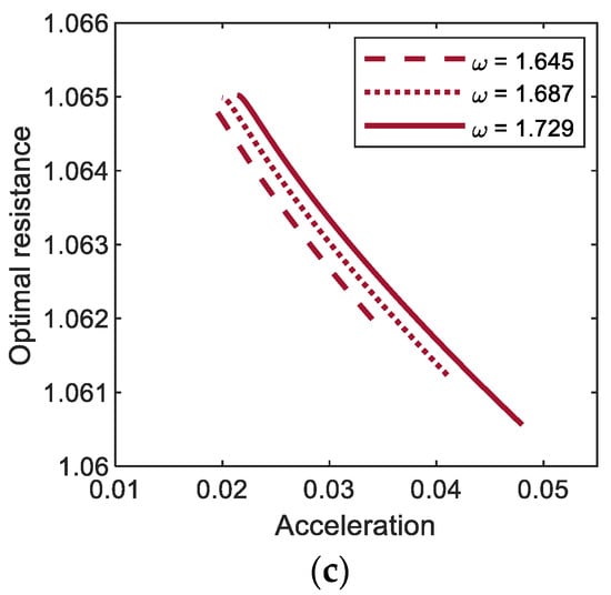 Using the semi-analytic method mentioned in the previous section, a parametric study is conducted to investigate the effects of the dimensionless resonant inductive reactance (defined by the ratio of to in Equation (3b)) and the excitation conditions (the frequency and intensity of the base excitation) on the optimal load resistance of the electromagnetic energy harvester, which is not considered in the resistance-matching technique.