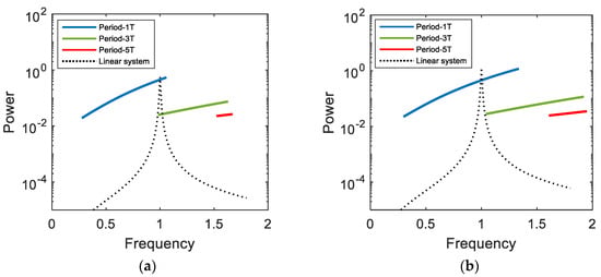 First, Fourier analyses are performed to find the appropriate solution forms of the steady-state primary harmonic and subharmonic interwell motions, which depend on the type and intensity of non-linearity [33], and the results of the time responses and the corresponding amplitude spectra are presented in Figure 5. The forcing period of the base excitation is given by , and accordingly the oscillation frequencies of the subharmonic period-3T and 5T motions tend to be lower than the forcing frequency ω, as shown in Figure 5c,e. Such subharmonic behavior is known to be a typical feature of a bi-stable system. Therefore, the fundamental oscillation frequencies of the interwell motions can be defined by , where k = 1, 3, and 5 for the period-1T, 3T, and 5T motions, respectively. From Figure 5b,d,f, it can be observed that the interwell motions only have two or three important frequency components: - and -components for the period-T motion, - and -components for the period-3T motion, and -, - and -components for the period-5T motion, as shown in Figure 5b,d,e, respectively. Thus, the steady-state periodic solutions can be assumed in the following forms of the Nth-order Fourier series:
