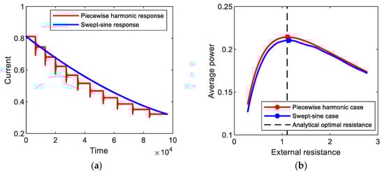 Figure 12a shows the amplitude of the output current response to (red line) piecewise harmonic excitation, which is obtained numerically for the period-1T interwell motion of the bi-stable electromagnetic energy harvester. In this simulation, the forcing frequency of the piecewise base excitation decreased from 1.0 by 0.05 to 0.5 for every 1000 cycles, but the amplitude of the base acceleration is set to be 0.02 g. The resulting output current response tends to intermittently vary with stepwise change in excitation frequency. Additionally, the average output power is evaluated with the variation of the external load resistance, as illustrated in Figure 12b. The optimal load resistance, 1.111, is estimated and compared with the analytical one, 1.104, evaluated by using Equations (6) and (8). The relative error of the analytical optimal resistance is very small (less than 0.7%), which supports the assertion that the proposed optimization approach is also valid for the piecewise harmonic excitation. In Figure 12a,b, the results for (blue line) swept-sine excitation are presented for comparison purposes. The swept-sine excitation continuously decreased with the slow sweep rate of 5 × 10−6 in the same frequency range. The output current response to the swept-sine excitation gradually decreases in the similar tendency to the piecewise harmonic case but with the difference in amplitude, which results in the difference in average output power. However, the optimal resistance, 1.139, for the swept-sine excitation (particularly with a slow sweep rate) is very similar to that for the piecewise harmonic case, with a small difference (less than 2.6%). This means that the semi-analytical optimal resistance is possibly used as an approximate for slowly swept excitation.