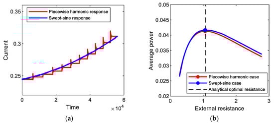 As another example, Figure 13 shows the output current responses to piecewise harmonic and swept-sine excitations, which is obtained numerically for the period-3T interwell motion. The forcing frequency of the piecewise base excitation increased from 1.0 by 0.05 to 1.5 for every 1000 cycles. The frequency of the swept-sine excitation increased with the sweep rate of 8.9 × 10−6. The numerical optimal resistances for the piecewise harmonic and swept-sine excitations are nearly close to each other, approximately 1.056. The semi-analytical optimal resistance, 1.059, is in good agreement with the numerical results for both the piecewise harmonic and swept-sine excitations.