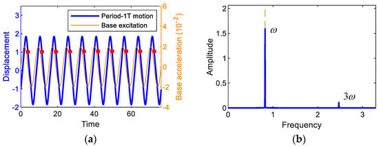 (first column) Time responses and (second column) the associated amplitude spectra, obtained by the fast Fourier transform. In (a,b) the period-1T motion when A = 0.02 and ω = 0.82, in (c,d) the period-3T motion when A = 0.02 and ω = 1.37, and in (e,f) the period-5T motion when A = 0.02 and ω = 1.65. The base excitation used for this simulation is also presented for comparison. In (a,c,e), the red dots indicate the stroboscopic projections of the oscillations, which are synchronized with the period T of the base excitation.