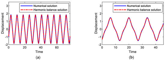 Substituting Equations (6a)–(6c) into Equations (3a) and (3b), followed by equating the coefficients of like harmonic components, leads to a system of non-linear algebraic equations for unknown variables , , , and , which are numerically solved by the Newton–Raphson method. As shown in Figure 3, the harmonic balance solutions (dashed-dotted lines) for primary harmonic and subharmonic interwell motions are well matched with the numerical solutions. Additionally, time-domain comparisons are made in Figure 6, where numerical and analytical results are also in a good agreement with each other.