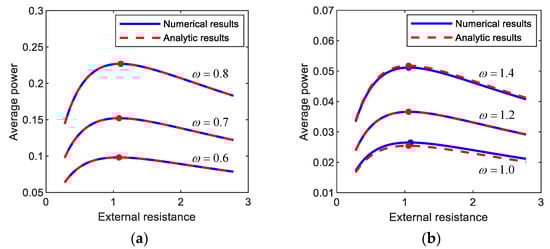 Using the obtained harmonic balance solutions, the average output power of the electromagnetic energy harvester can be evaluated as , and the optimal value of the external load resistance is estimated by solving the optimization problem of . The optimal external load resistance reduces to 1 for the same problem when the resistance matching technique is used.