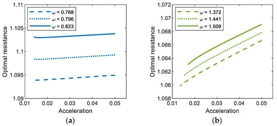 Using the semi-analytic method mentioned in the previous section, a parametric study is conducted to investigate the effects of the dimensionless resonant inductive reactance (defined by the ratio of to in Equation (3b)) and the excitation conditions (the frequency and intensity of the base excitation) on the optimal load resistance of the electromagnetic energy harvester, which is not considered in the resistance-matching technique.
