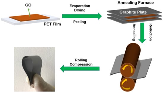 As is shown in Figure 1, the fabrication of the HCGAF included the following steps: the self-assembly of a graphene oxide (GO) suspension by evaporation at room temperature, high-temperature heat treatment, and static calendering. The GO suspension was diluted with ultrapure water to a concentration of 15 mg mL−1 in a square vessel. After mechanical stirring at room temperature, the diluted GO suspension was evaporated to obtain the GO film. The GO film was annealed in an Ar gas flow furnace at the high temperatures of 1300 and 3000 °C for 2 and 1 h, respectively, achieving the reduction and graphitization of pre-HCGAF. The pre-HCGAF was attached to the Polyethylene Terephthalate (PET) substrate by static calendering with a pressure of 100 MPa for 0.5 h at room temperature, and then, the HCGAF was formed; a photograph of the HCGAF under a bending state is shown in Figure 1. To ensure a material with an ideal structure of graphene layers and high conductivity, the following characterization of the HCGAF was carried out.