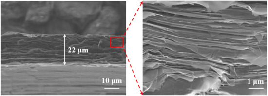 First, the material structure was inspected with the JSM-7100F scanning electron microscope (SEM). In Figure 2, the cross-sectional and the highly magnified SEM images of the HCGAF show that the film is based on orderly stacked graphene layers with a thickness of 22 μm. The skin depth, δs, is related to the frequency and is an intrinsic property of a conductive material. It is defined as the thickness of the material that ensures the effective flow of electrical currents. When the field in the conductor is transmitted a distance of the skin depth, its amplitude decays to 1/e. The δs of the HCGAF was 12 μm at 900 MHz; the HCGAF’s thickness had enough space for electrical current flow.