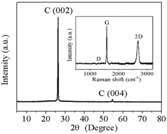 Second, XRD patterns were collected using X-ray D/MAX-RB instruments with Cu Ka radiation, and Raman spectroscopy was performed using a Renishaw Raman Spectrometer. The sharp diffraction peak of the (002) plane in the X-ray diffraction (XRD) pattern was located at 2θ = 26.5° (Figure 3), indicating an interlayer spacing of 0.336 nm. The unobvious D band (1329 cm−1) and strong 2D band (2684 cm−1) in the Raman spectroscopy (inset of Figure 3) indicate a highly graphitized structure [37,38]. Additionally, due to the π–π interactions of 2D nanosheets in the graphene layer, the 2D nanosheets can easily slide between each other along the plane and maintain great adhesion power, leading to the remarkable mechanical and electrical stability of the HCGAF upon bending.