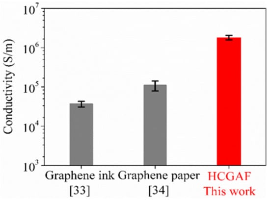 Meanwhile, the conductivity, σ, was measured by the Four-Point Probes Resistivity Measurement System (RTS-9). As shown in Figure 5, the HCGAF had a conductivity of 1.82 × 106 S m−1, which is at least one order of magnitude higher than the conductivity of graphene-based films reported previously. The sheet resistance, Rt, was also measured; the lower the sheet resistance of the material, the faster the electrical currents flow on its surface. As an index to judge the conductivity of materials with, the sheet resistance can be calculated from the conductivity and thickness. The sheet resistance of the HCGAF was 25 mΩ, which is the lowest value for graphene-based films to date. In terms of graphene ink, polymer-stabilizing agents (such as cellulose acetate butyrate) are often added into the inks so that the graphene flakes can be uniformly dispersed and the printing performance is improved. The insulating polymer-stabilizing agents attached to the surface of the graphene sheets will inevitably lead to a sharp increase in the resistance of the graphene and a decrease in the conductivity [33]. Meanwhile, graphene papers are prepared by the compression of the powder of graphene nanoplatelets under some pressure at room temperature. Without a high-temperature heat-treatment process, the self-healing of the sp2 structure in graphene papers cannot be realized, and the contact resistance of the internal structure is large, which leads to the resistance still being large [34]. The measurement results for the conductivity and sheet resistance show that the HCGAF is suitable as an antenna for receiving and transmitting electromagnetic waves of microwave frequency.