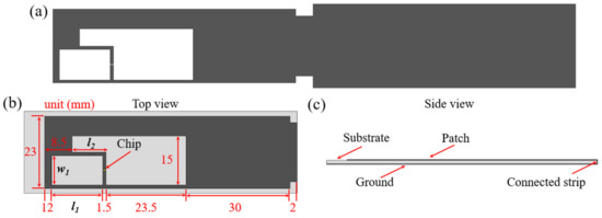 The structure of the proposed anti-metal RFID tag antenna made of the HCGAF is shown in Figure 6a. The antenna consists of a radiation patch, a ground and a connected strip. The rectangular slot and the inverted-L-shaped slot on the patch can not only increase the electrical length to achieve the miniaturization of the antenna, but also provide the inductive reactance to facilitate conjugate matching with the capacitive reactance of the chip [41]. The patch is connected to the ground by a short circuit strip, and then, the antenna wraps around the flexible polyethylene (PE) foam substrate (the dielectric constant εr = 1.22) with a thickness of 1 mm to form a current loop without adopting metallic via holes. The corresponding structural parameters can be observed in Figure 6b,c.