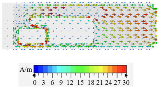The parameter optimization of the anti-metal tag antenna was carried out in the CST Microwave Studio Suite. When conducting the simulation, the tag was placed at the center of a 20 × 20 cm2 flat copper plate. Before performing a parameter scan, the simulated surface electrical current distribution of the antenna at 920 MHz was as provided in Figure 7. The arrows represent the surface electrical current flow path, and the amplitudes of the surface electrical currents are distinguished by colors. It was found that high current densities were concentrated around the rectangular slot and the insertion part of the inverted-L-shaped slot, indicating that the complex impedance and resonance frequency of the antenna can be effectively affected by changing the rectangular slot length, l1; the rectangular slot width, w1; and the inverted-L-shaped slot insertion length, l2.