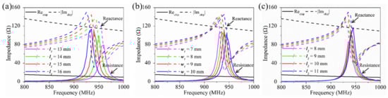 Similarly, the effects of different w1 and l2 on the simulated complex impedance of the antenna are also analyzed in Figure 8b,c, respectively. The resistance of the antenna decreased from 29 to 8.5 Ω at 920 MHz when w1 increased from 7 to 10 mm, and at the same time, the reactance decreased from 130 to 117 Ω. However, the opposite phenomena can be observed when l2 increased from 8 to 11 mm; the resistance decreased but the reactance increased. According to the previous analysis, l1 is convenient to roughly modulate the antenna complex impedance with, while w1 and l2 are more suitable for finetuning. Therefore, by synergistically adjusting l1, w1 and l2, the final optimized values of l1, w1 and l2 were determined to be 15, 9 and 10 mm, respectively.