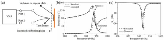 Antenna performance measurements: (a) schematic diagram; simulated and measured (b) complex impedance and (c) reflection coefficient of the antenna with optimized parameters.