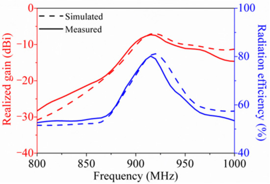 where Gt is the gain of the tag, Pc is the chip sensitivity, Pth is the measured threshold power, and Lfwd is the forward path loss from the reader output port to the tag input port. Among these parameters, Gt and τ could be acquired by simulation, and Pc was provided by the chip manufacturer (for the R6 chip, Pc = −20 dBm), while Pth and Lfwd needed to be measured during calibration. The realized gain and radiation efficiency measurements of the tag were performed using the VNA, Diamond Engineering Antenna Measurement Studio and a rotary table in an anechoic chamber. As shown in Figure 10, the measured peak realized gain could reach –7.3 dBi at 915 MHz, which is 0.7 dBi lower than that of the simulated one, despite a little frequency offset (–6.6 dBi at 920 MHz), since the transmission path loss and manufacturing tolerance were not considered during the simulations. Besides, the radiation efficiency, as another vital evaluation index for the antenna, was also determined. It is evident that the radiation efficiency reached 80% at 915 MHz, fitting well with the simulated ones.