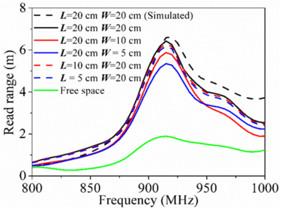 In Figure 12, the simulated and measured read ranges of the tag on a copper plate with L = 20 cm and W = 20 cm are represented by a black dashed line and black solid line, respectively. It is obvious that the measured read range (6.4 m at 915 MHz) of the tag was almost consistent with the simulated one (6.6 m at 920 MHz), despite the frequency deviation and little degradation of the performance. Besides, we investigated the effect of the ground on the read range by changing its size. It should be noted that the measured read range remained stable when L decreased from 20 to 5 cm but W = 20 cm was fixed (red and blue dashed lines). On the contrary, if we changed W but held L, the test results gradually decreased from 6.4 to 5.3 m as W was reduced (red and blue solid lines). Even like this, it still maintained high-level performance. In addition, the read range of the tag dramatically deteriorated when getting rid of the metallic plate.
