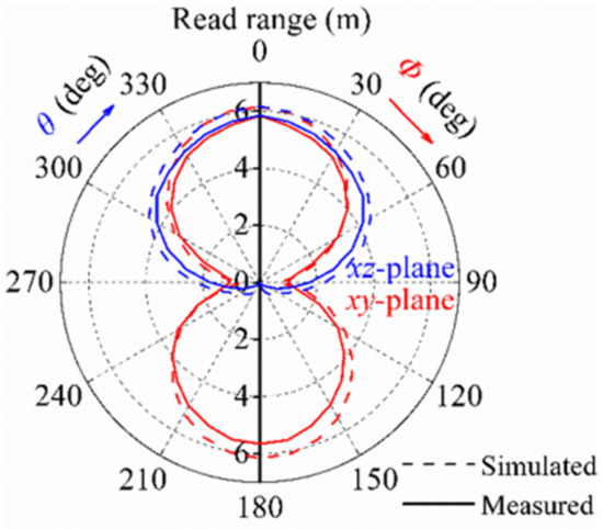 To comprehensively reveal the performance of our design backed by a 20 × 20 cm2 flat copper plate, the measured and simulated two-dimensional (2D) radiation patterns in terms of the read range at 915 MHz in the xy plane and xz plane are presented in Figure 13. Concerning the xy plane, the measured read range exceeded 4 m in the angular ranges of |φ| ≤ 50° and |φ| ≥ 130°. Unlike for the xy plane, due to the shielding effect, the measured read range across the xz plane was almost zero, when |θ| was larger than 90 degrees.