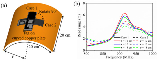 The measured read ranges of the tag on curved copper plates with the same area but different bending radii are shown in Figure 14b; as the r of the curved copper plate decreased from 12 to 8 cm, it can be observed that the read range of the tag decreased from 6.2 to 5.5 m at 915 MHz in case 1 (solid lines), and the read range of the tag decreased from 4.9 to 4.1 m at 915 MHz in case 2 (dash lines). The read range always decayed gradually within an acceptable level, which was caused by the deformation of the tag antenna and the reduction of the effective radiation aperture. Note that as a result of the smaller shape changes, the tag in case 1 could acquire a longer read range than that of case 2 in terms of the same r. It is also worth mentioning that there was almost no shift in the resonant frequency of the tag, even though the tag had a certain deformation.